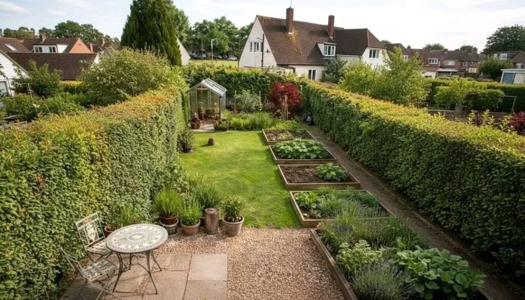 Tall hedges and trees frame the garden, offering:
