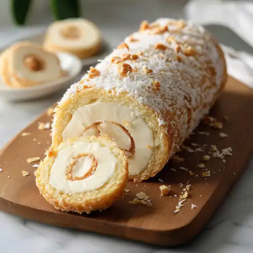 Description de cette recette: Le biscuit roulé à la noix de coco et chocolat blanc est un dessert élégant et gourmand qui combine la légèreté d’un biscuit moelleux avec l’exotisme de la noix de coco et la douceur du chocolat blanc. Cette recette, facile à réaliser, est parfaite pour impressionner vos convives lors d’un dîner ou pour une pause gourmande. Elle offre une texture aérienne et des saveurs délicates qui se marient à merveille, faisant de chaque bouchée un véritable plaisir.