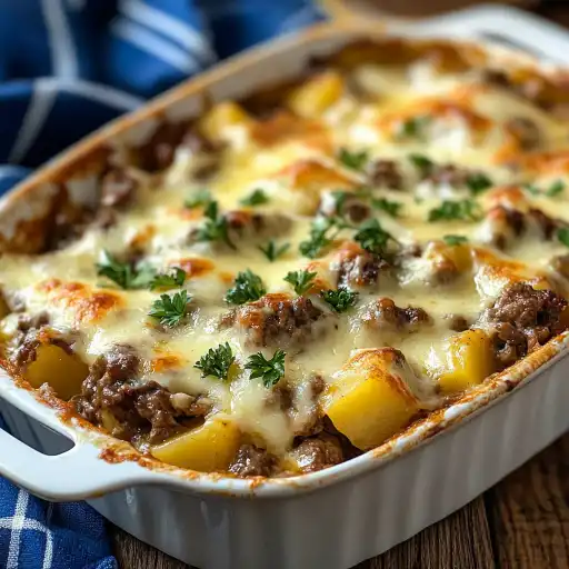 Description de cette recette : La casserole crémeuse de bœuf haché et pommes de terre est un plat réconfortant et familial, parfait pour les soirées fraîches ou les repas dominicaux. Ce gratin généreux combine la richesse de la viande hachée, la douceur des pommes de terre fondantes et l’onctuosité d’une sauce crémeuse, le tout gratiné sous une couche de fromage doré. C’est un plat simple à réaliser, avec des ingrédients courants, mais qui impressionnera à coup sûr vos convives. Chaque bouchée est un voyage gustatif où les saveurs se marient harmonieusement, offrant une expérience culinaire inoubliable.