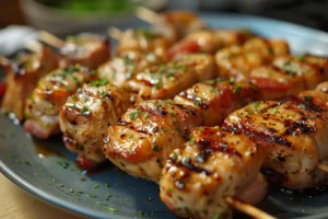 Cette recette comprend de succulentes brochettes de poulet marinées dans un savoureux mélange de miel et d’ail et enveloppées de bacon croustillant, créant un plat appétissant qui est parfait pour …