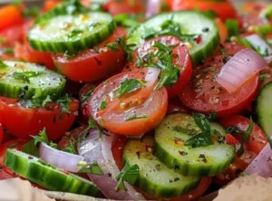 Cette salade rafraîchissante de concombres, tomates et oignons est un plat d’accompagnement d’été parfait ou un repas léger. La combinaison de concombres croquants, de tomates raisins juteuses et d’oignons acidulés …
