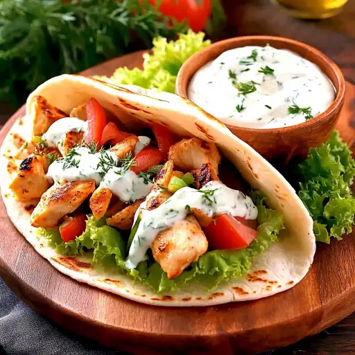Ce pain pita revisité est un concentré de saveurs et de fraîcheur, parfait pour un déjeuner sur le pouce, un dîner léger ou un pique-nique gourmand. Le poulet mariné aux épices, grillé à la perfection, se marie à merveille avec le croquant des crudités et l’onctuosité de la sauce yaourt aux herbes. Un véritable voyage gustatif au cœur de la cuisine méditerranéenne.