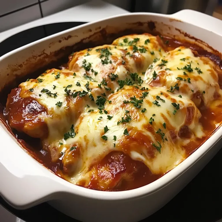 Étape 6: Assembler le plat. Placer les blancs de poulet dorés dans un plat allant au four. Napper généreusement chaque blanc de poulet avec la sauce tomate préparée. Assurez-vous que le poulet est bien recouvert de sauce pour qu’il reste tendre et juteux pendant la cuisson au four.