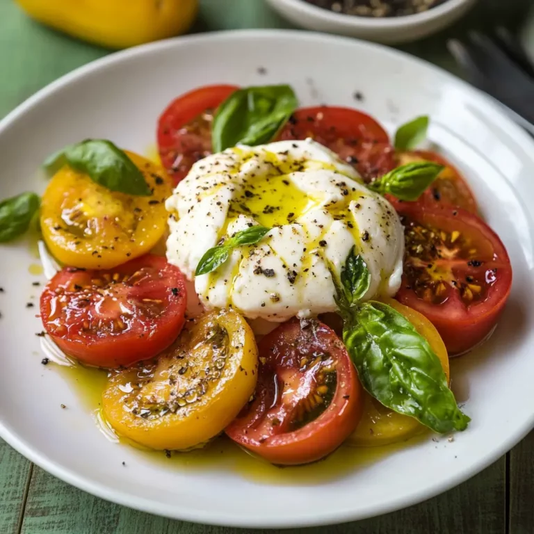 La Salade Burrata & Tomates Heirloom est un plat simple, élégant et savoureux qui met en valeur les meilleurs ingrédients de l’été. Elle est parfaite pour toutes les occasions, des déjeuners décontractés aux dîners sophistiqués. Facile à préparer et visuellement attrayante, cette salade deviendra rapidement un incontournable de votre répertoire culinaire. Alors, n’attendez plus, procurez-vous des tomates anciennes colorées, une burrata crémeuse et du basilic frais, et laissez-vous transporter en Italie avec cette recette ensoleillée! Bon appétit!