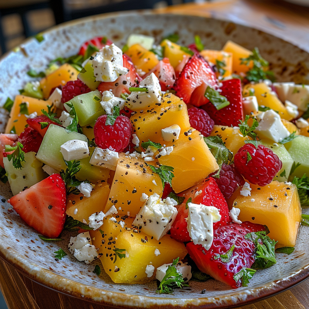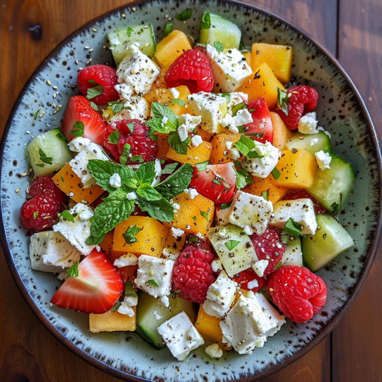 Améliorez votre jeu de salades avec cette combinaison délicieuse et colorée de fruits et légumes frais. Le mélange de fraises, de melon, de concombre, de fromage feta et d’une vinaigrette sucrée crée une symphonie de saveurs qui vous donnera envie de plus. Cette salade est non seulement attrayante visuellement, mais elle regorge également de nutriments, ce qui en fait un choix sain pour toute occasion.