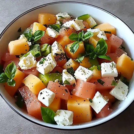 Pourquoi vous allez adorer cette recette: Cette salade est un véritable concentré de bonheur gustatif. Elle est facile et rapide à préparer, ce qui en fait un choix idéal pour les déjeuners sur le pouce ou les dîners improvisés. Elle est également incroyablement polyvalente : elle peut être servie en entrée pour ouvrir l’appétit, en plat principal léger pour une pause déjeuner revitalisante, ou en accompagnement d’un barbecue pour ajouter une touche de fraîcheur. Mais surtout, vous allez adorer cette salade pour son équilibre parfait de saveurs et de textures. La douceur juteuse du melon contraste magnifiquement avec le sel délicat du jambon et la richesse crémeuse de la feta. La vinaigrette citronnée, avec son parfum subtil de thym, lie tous ces éléments ensemble, créant une harmonie gustative irrésistible. Chaque bouchée est une explosion de saveurs, une expérience sensorielle qui vous transporte instantanément en vacances. C’est une salade qui réveille les papilles et qui apporte une touche de soleil à votre table.