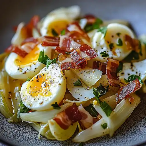 Serving Suggestions: Cette salade tiède d’endives sautées, lardons et œuf mollet peut être servie en entrée ou en plat principal léger. Elle s’accompagne parfaitement d’une tranche de pain de campagne grillé ou de quelques croûtons à l’ail. Pour un repas plus copieux, vous pouvez ajouter une portion de poulet grillé ou de poisson poêlé.