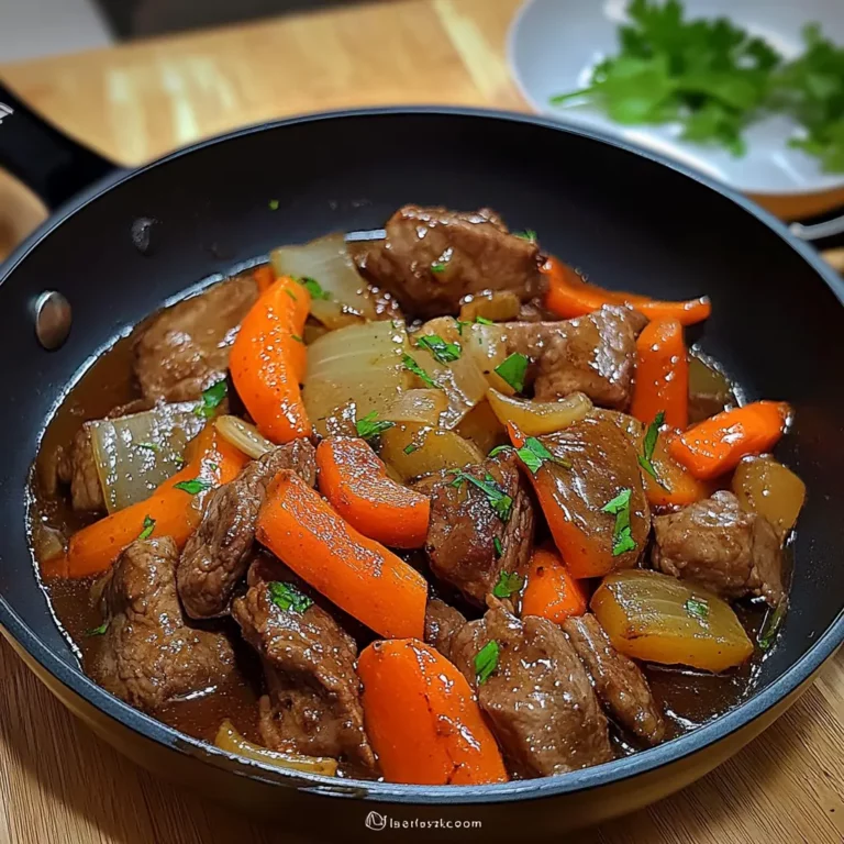Pendant que la viande marine, préparez les légumes. Épluchez les carottes et coupez-les en rondelles fines. Émincez l’oignon finement. Hachez le persil frais et réservez-le pour la garniture. Si vous utilisez de la fécule de maïs, mélangez-la avec 1 cuillère à soupe d’eau dans un petit bol et réservez.