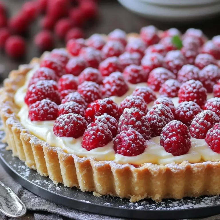 Description de cette recette: La tarte aux framboises et crème pâtissière est un dessert français classique, apprécié pour sa simplicité élégante et ses saveurs fraîches et fruitées. Cette recette offre une base de pâte sablée croustillante, une crème pâtissière onctueuse et une généreuse garniture de framboises fraîches, le tout saupoudré d’un voile délicat de sucre glace. C’est une tarte parfaite pour toutes les occasions, des déjeuners dominicaux aux dîners entre amis.