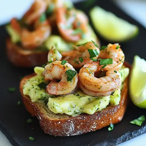 Description de cette recette: Les tartines de pain de campagne à l’avocat, crevettes et piment sont une explosion de saveurs et de textures qui raviront vos papilles gustatives. Cette recette simple et élégante est parfaite pour un déjeuner rapide, un apéritif sophistiqué ou un dîner léger. La combinaison crémeuse de l’avocat, la fraîcheur des crevettes, le piquant du piment et la robustesse du pain de campagne en font un plat irrésistible et facile à préparer.
