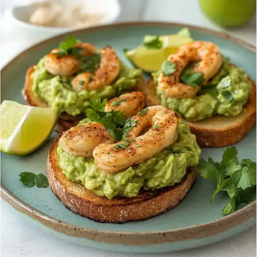 Tartinez généreusement chaque tranche de pain grillé avec le guacamole. Répartissez ensuite les crevettes sur le guacamole. Saupoudrez de zeste de citron vert et de coriandre fraîche ou de ciboulette ciselée. Pour une touche de gourmandise supplémentaire, vous pouvez ajouter quelques gouttes d’huile d’olive vierge extra ou une pincée de paprika fumé.